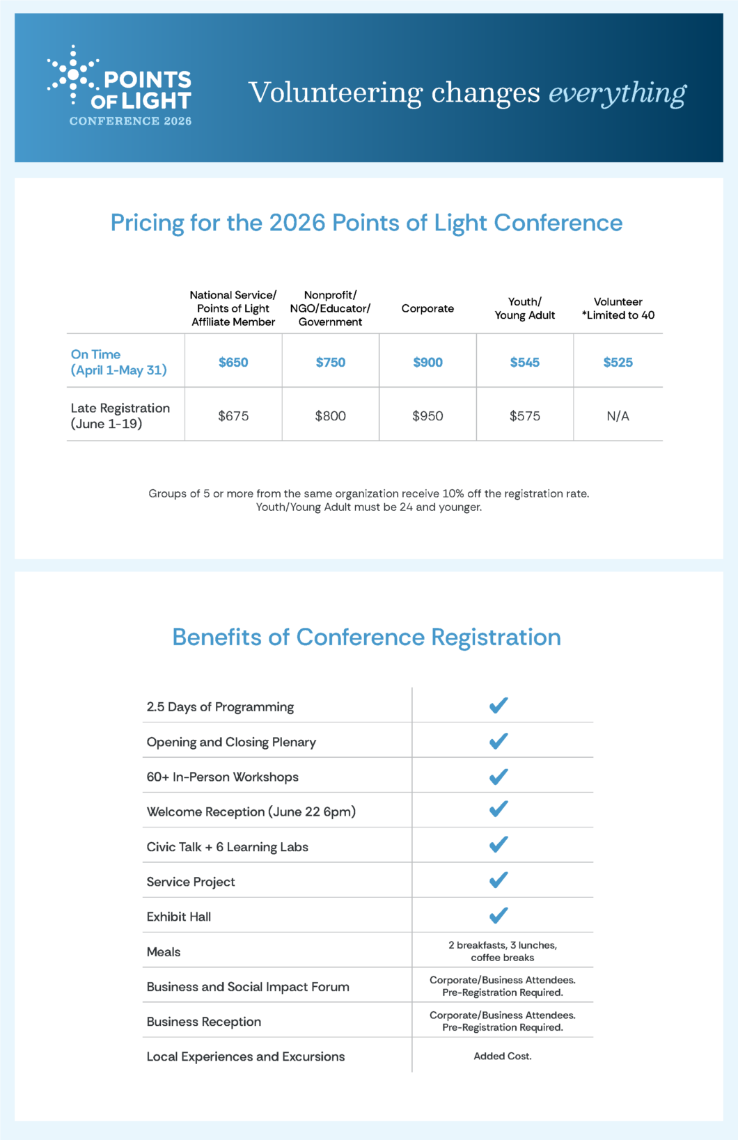 For organizations dedicated to making a positive change in the world and corporate social impact professionals ready to advance your cause: Learn more about how your company or organization can become a part of the Points of Light Conference.