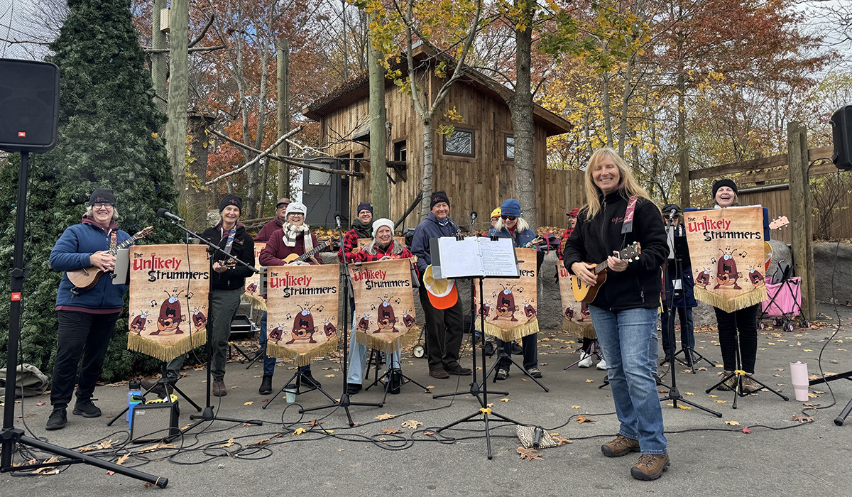 Cindy and her group, the Unlikely Strummers, smile for the camera as they perform at Roger Williams Zoo in Providence, Rhode Island./ Courtesy Cynthia Miller