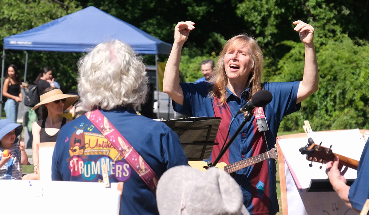 Cindy, who also works as an anthropology professor and animal control officer, serves as the group’s music director, arranger, teacher and community liaison. Most of the group’s members are over 65 — many of them first-time musicians who hadn’t picked up an instrument since grade school. Under her leadership, the Unlikely Strummers bring live music to senior centers, children’s hospitals, animal rescues, sporting events, school assemblies and community festivals. The group also actively fundraises for the Ukulele Kids Club, a nonprofit that donates ukuleles to children’s hospitals for music therapy programs, raising over $20,000 in a single year.