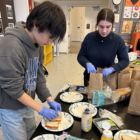 Daniel (left) and his co-president assemble meals to donate to the Love Fridge.