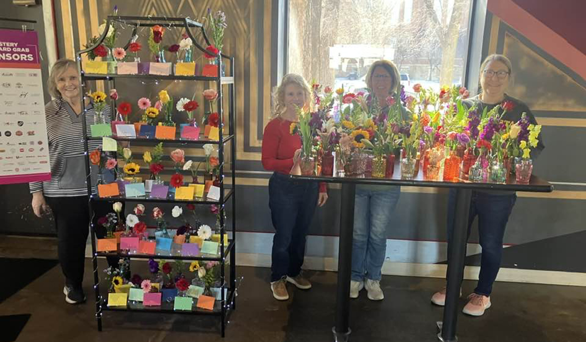 Sue (left) and fellow volunteers raise $4,000 in donations through the 200 mystery gift cards and flowers they solicited for the 2025 CADA Galentine fundraiser.