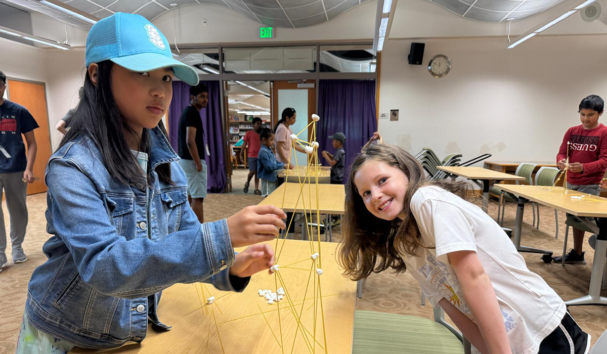 Students pose for a photo with their marshmallow tower moments before it collapses at one of Project Catalyst’s Alameda County district-wide events.