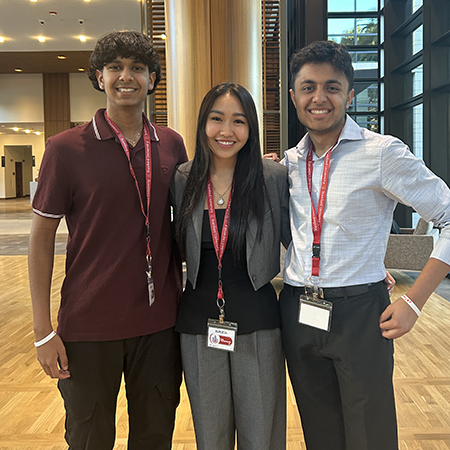 Founder Shivansh Bansal and Director of Research Raman Arora pictured at the 2024 Stanford SURGExpo, representing Project Catalyst, with Forbes 30U30 honoree, Pear Chotbunwong.