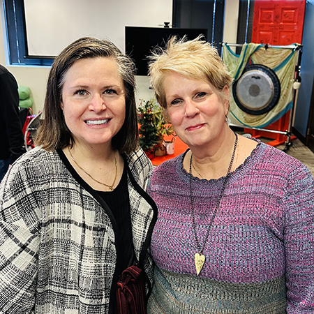 Gilda’s Club of Minnesota executive director Katherine Todd (left) and Eva (right) enjoy the annual holiday gathering designed to thank staff for their contributions and commitment to the club.