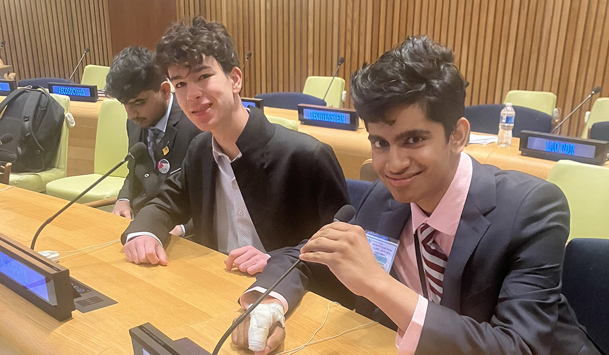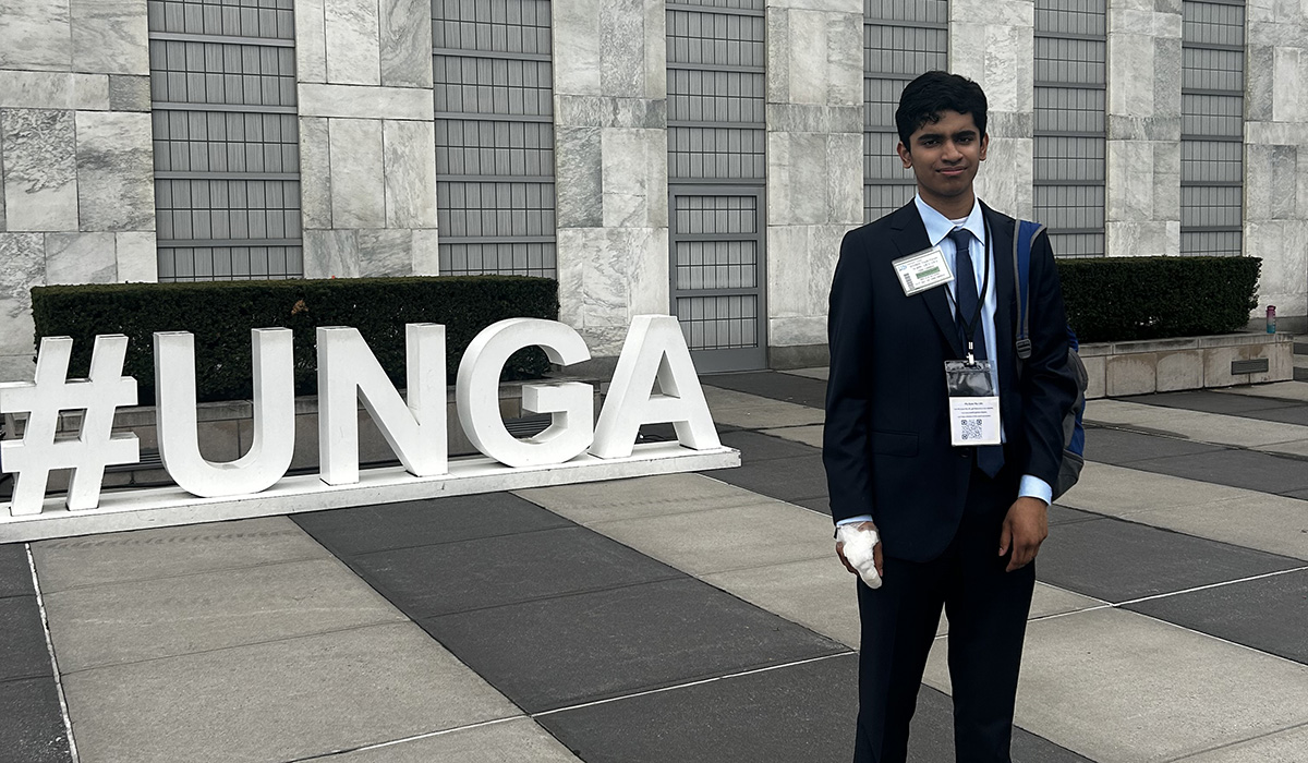 [IW1.1][GU1.2]Ayaan (right) presents My Eyes My Life at the United Nation’s ECOSOC Youth Forum 2025.